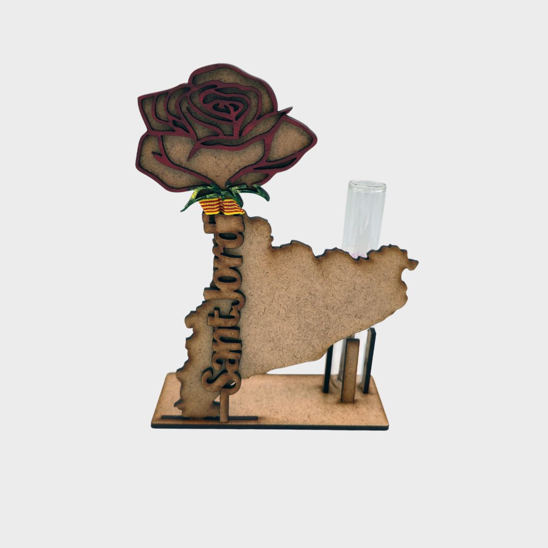 Silueta de Cataluña en madera para rosa de Sant Jordi, con un diseño único que combina tradición y elegancia. Sobre la silueta se adhiere una rosa de madera, de tamaño superior a la figura de Cataluña, con el tallo con la palabra «Sant Jordi». En la base incorpora una probeta, pensada para colocar una rosa natural o liofilitzada, convirtiendo esta pieza en un detalle especial y simbólico para regalar el dia de Sant Jordi o para decorar cualquier espacio con encanto.