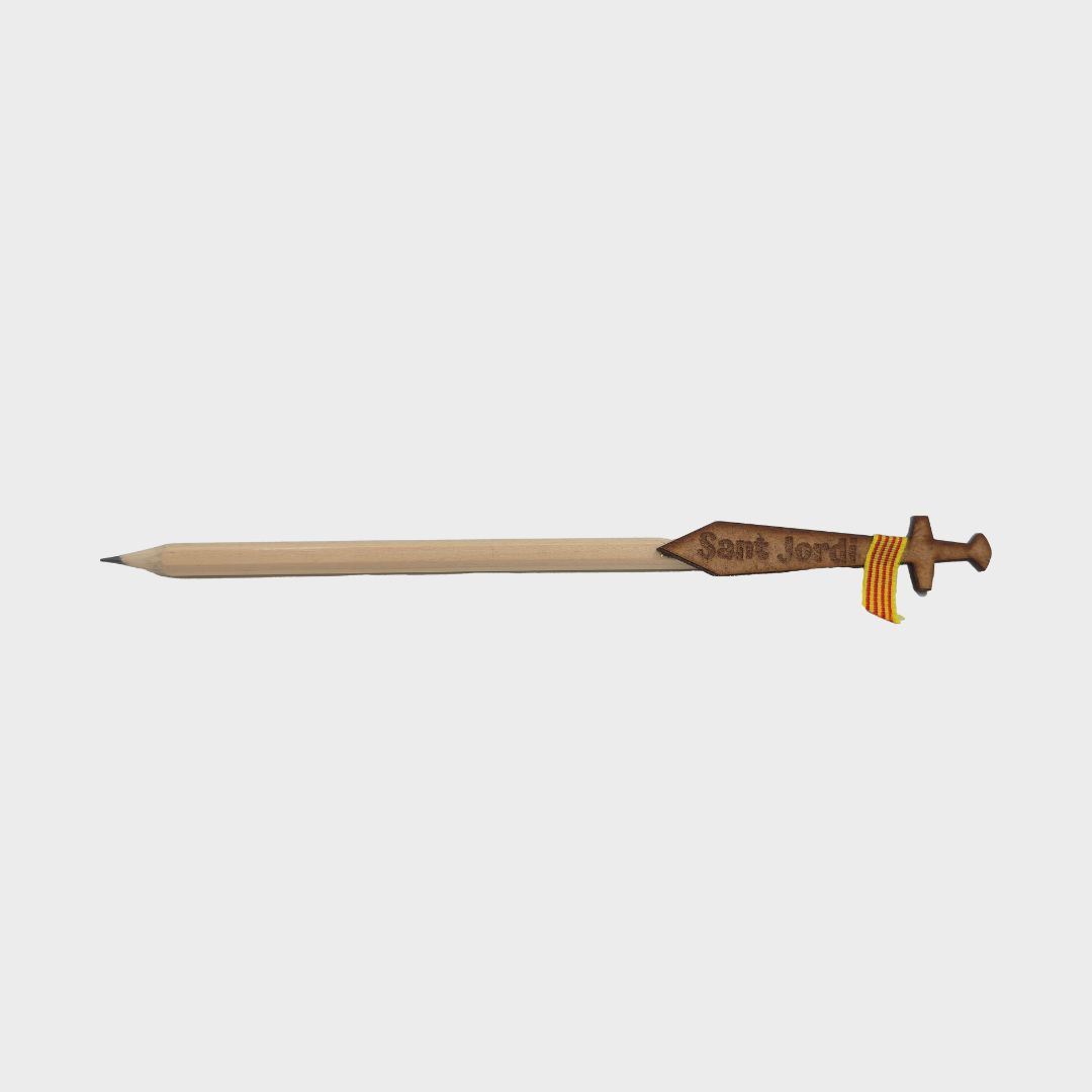 Este lápiz de madera presenta una espada grabada de Sant Jordi junto a la bandera textil que la acompaña, combinando la artesanía tradicional con un símbolo profundo de la cultura catalana. Un detalle único que rinde homenaje a la leyenda de Sant Jordi.